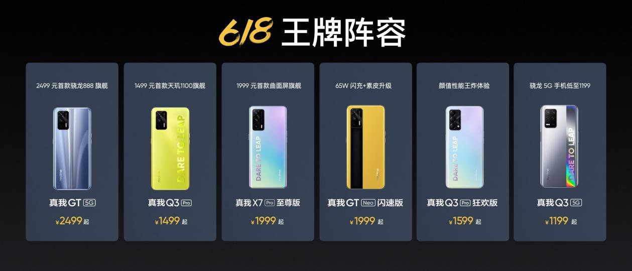 真我GT系列、真我Q3 系列等6大产品组成的主力同花顺,以极具心跳的价格迎战618,冲刺百万台销量。在竞争力十足的价格上,参加618的产品最高直降400元,预售期间部分产品享12期分期免息,新机礼包、耳机、延保等福利