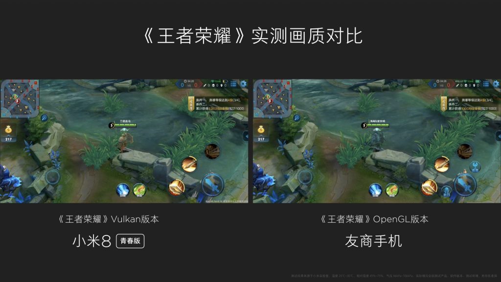 小米 8 芳华版选用新一代 3D 烘托图形接口 Vulkan,Vulkan 是一个跨途径的 2D 和 3D 绘图使用接口,能够下降 CPU 剖析游戏硬件需求时履行的后台作业。小米 8 芳华版也是首部支撑 Vulkan 版《王者荣耀》的骁龙 660 手机。