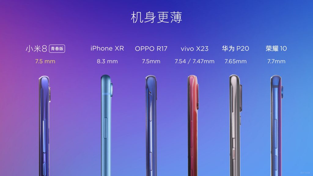 小米 8 芳华版的机身厚度为 7.5mm,和 OPPO R17 相同,比 iPhone XR 薄了 0.8mm。作为一款选用全面屏规划的手机,小米 8 芳华版也参加了“刘海”规划,不过小米 8 芳华版的“刘海”也比 iPhone XR 小了一些。小米 8 芳华版供给暮光金、梦境蓝、深空灰三种配色,2.5D 玻璃机身,纳米溅镀工艺,带来共同的镜面作用。