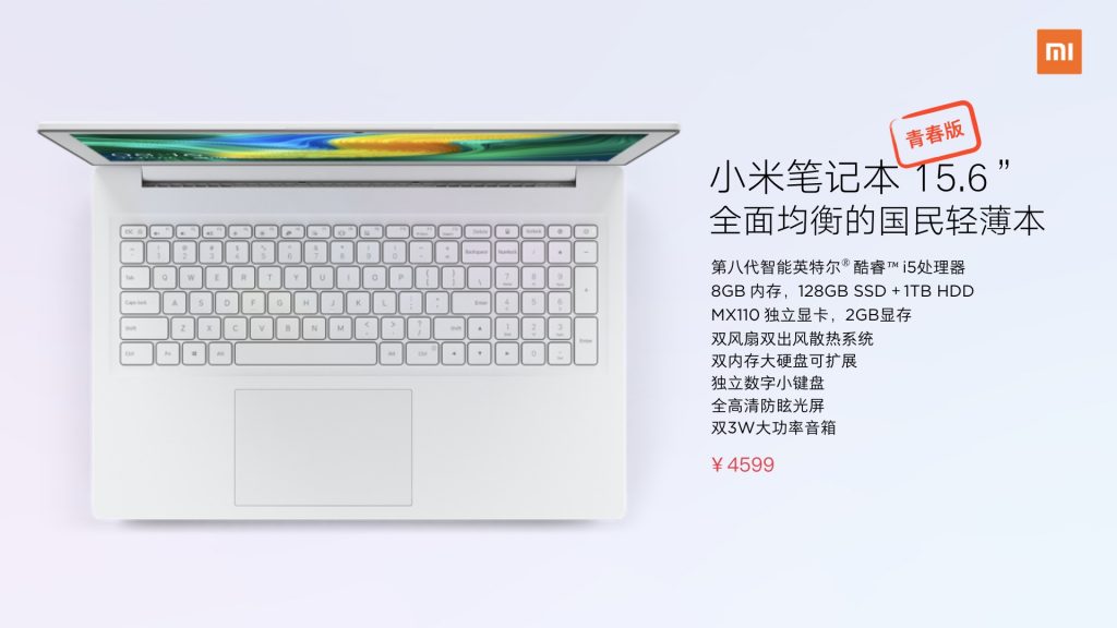 这次发布会的最终,小米还发布了 15.6 英寸的小米笔记本芳华版,搭载第八代智能英特尔酷睿 i5 处理器,8GB 内存,128GB SSD + 1TB HDD,价格 4599 元。
