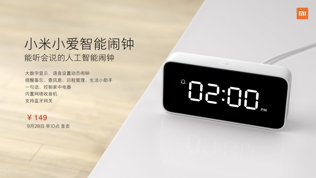 智能家居方面,小米推出小米小爱智能闹钟,内置“小爱同学”,支撑蓝牙网关,并内置网络收音机,价格 149 元,9 月 28 日 10 点首卖。