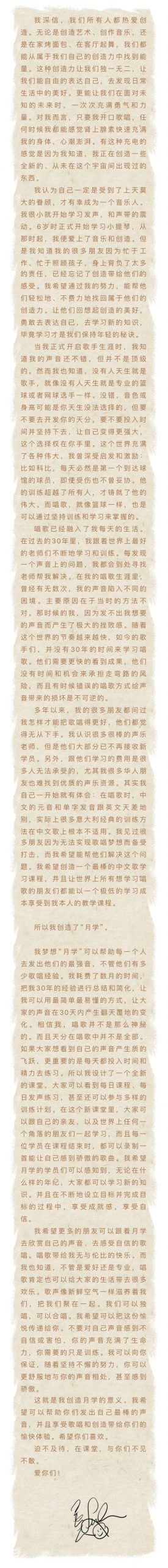 中写道,“我期望发明一个最棒的中文歌学习课程,而且让世界上一切想学习歌唱的朋友们都能以一个极低的学习本钱享用到我自己的教育课程。”“我期望更多的朋友能够跟着月学去赏识自己的声响、去感触自傲的歌唱。”王力宏如是说。